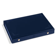 Mørkeblå møntboks af højkvalitets kunstlæder med præget ornament på låget. Bogbindingsbehandling. 2 messingfarvede trykknapper. Udvendigt format: 355 x 50 x 250 mm. Indhold: 2 rum (L-formet) hver til 24 mønter op til 45 mm Ø, 2 rum til 40 mønter hver op til 33 mm Ø.