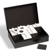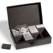 Møntkassette til opbevaring af op til 100 QUADRUM møntkapsler. Møntboks lavet af sort kunstlæder (polstret). De 4 "propper" der følger med i leveringen bruges til at fikse rækker, der ikke er helt fyldte (ikke at kapslerne vælter). Også velegnet til opbevaring af møntholdere (50 x 50 mm) (ca. 320 stk.). Udvendigt format: 225 x 181 x 77 mm.